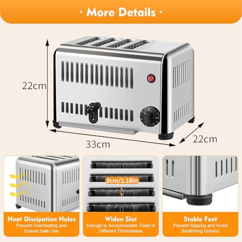 - 【PRECISE TIMING】 Commercial Toaster Features a 1-5 Minute Timing Function for You to Taste the Rich Taste. the Longer the Timing the Crispier the Taste of the Bread. Working secting swich is printed (-= ) .When you put swich in (-) position only halt of slots work; when you put switch in (- =) position all slots work.