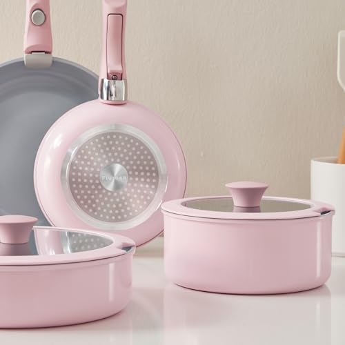 Florosa Ceramic Pots and Pans Set Non Stick with Removable Handle Detachable Handle Pots Pans, 5pcs Nonstick Cookware Set Non Toxic PFAS/PTFE Free Pink