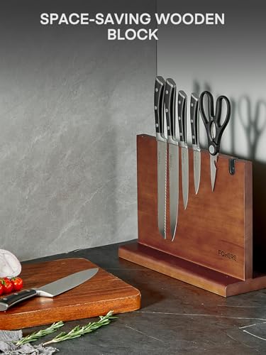 Magnetic Knife Set with Block, FOHERE Kitchen Knife Set with Built-in Sharpener, 7 Pieces Sharp Chef Knife Set with Ergonomic Handle, Waved Pattern High Carbon Stainless Steel Knives Set for Kitchen