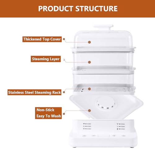- 【6 Preset Cooking Modes】 Electric food steamer include 6 preset cooking modes for specific foods such as pastry, grains, egg custard, seafood, meat and fish. Steaming food with preset programs can save time, as it eliminates the need to monitor the cooking process closely.