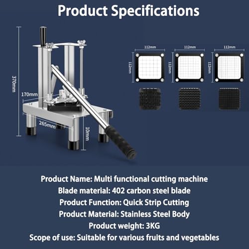 • Customizable Cutting: Equipped with three interchangeable knife grids (14MM, 10MM, and 7MM), our fry cutter for potatoes allows you to select the perfect size for your culinary creations. Simply choose your desired blade and enjoy uniform cuts every time, whether for french fries, carrot strips, or any other vegetable