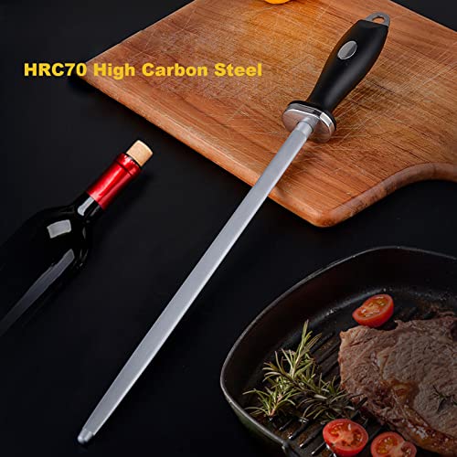 - 【PREMIUM MATERIAL&CRAFTSMANSHIP】This 12 Inch professional knife sharpener rod is forged from high carbon steel by high temperature hardening, the hardness up to 70 HRC; The ABS frosted handle with non-slip curved design, strong, non-slip grip, comfortable and durable, no cracking; Using innovative technology to polish 3000 grit surface steel rods, ultra-dense tooth pattern, sharp in seconds, no damage to the blade.