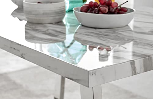 • Impressive rectangular dining table with a white marble effect high gloss surface supported by U-shape chrome legs for an attractive design.