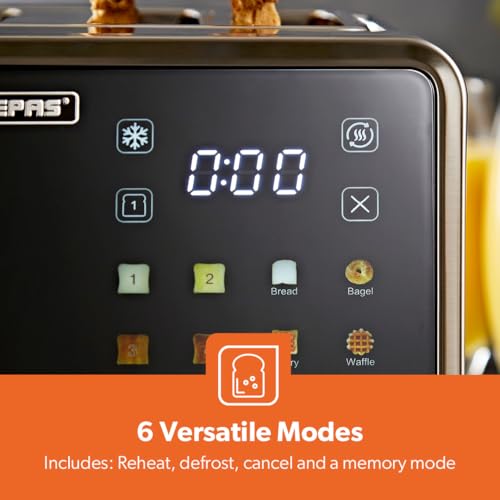 - ✅ 5 FUNCTION TOASTING WITH SELF-CENTERING – This black 4 slice digital toaster offers five smart modes: Reheat warms toast without overbrowning, Defrost perfectly toasts frozen slices, Single saves energy with one-slot toasting, Cancel lets you stop anytime, and Power ensures efficient use. Its self-centering guides keep bread aligned for even toasting on both sides, giving consistent golden results every time.