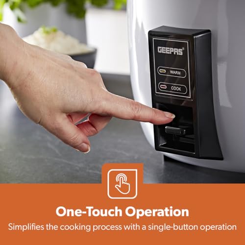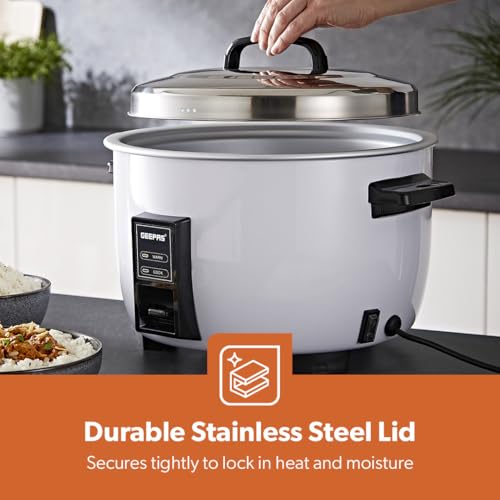 • Geepas Commercial Rice Maker 4.2L, 1600W | Non-Stick Aluminium Removable Inner Pot | Auto Switch from Cook to Warm | Stainless Steel Lid with Measuring Cup & Spatula White (Renewed)