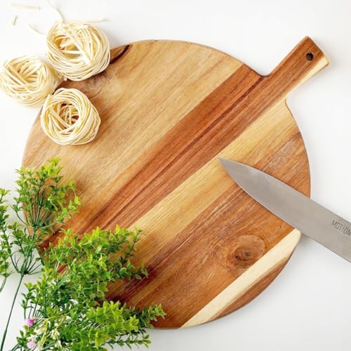 GEEZY Round Acacia Wooden Chopping Board with Handle Kitchen Large Cutting Board Vegetables Meat Chicken Fruits Pizza Cheese Serving Platter