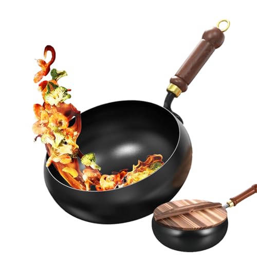 Générique Non Stick Pan, Stir Fry Wok, Wooden Handle Scratch Resistant Cookware, Flat Bottom Induction Wok, No Coating, Healthy Cooking Pot, for Baking, Stewing, Stir-Frying, Kitchen, Stove