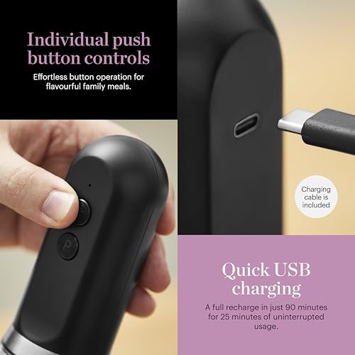 GF847069 Good Food in Partnership with Tower Duo Salt & Pepper Mill, Rechargeable with Adjustable Ceramic Grinders, Individual Push Buttons, Black with Brushed Chrome Accents