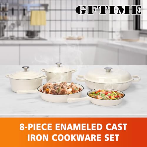 GFTIME Enamel Cast Iron Cookware Set – 8 Piece Non-Stick Casserole and Frying Pan Set with Lids, Dutch Oven, Skillet, Saucepan for All Hob Types, Ideal for Bread Baking, PFA Free, White