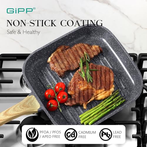 GiPP Nonstick Griddle Pan for Stove Tops,28cm Grill Pan for Indoor Cooking & Outdoor Grilling,Square Grill Skillet Steak Pan,PFOA Free (Grey, 28cm)