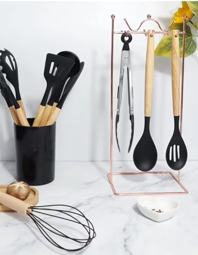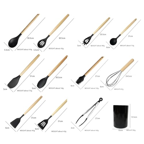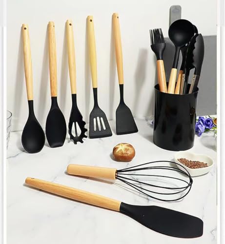 GJIE Kitchen Utensil Set, 12 PCS Silicone Cooking Utensils Set with Wooden Handle, Heat Resistant, Nonstick Cookware Tongs Spatula Spoon Set, Dishwasher Safe, Best Kitchen Tools (Black)