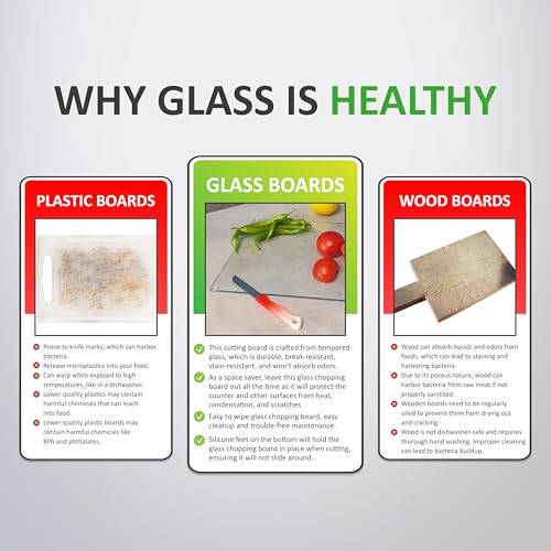 - Elegant Design – Crystal-clear tempered glass with a modern rectangular form adds a touch of class to your kitchen. Hygienic Surface – Non-porous glass prevents bacteria buildup, unlike wooden or plastic boards. Scratch & Stain Resistant – Durable surface resists knife marks, odors, and stains, keeping it fresh-looking. Multi-Purpose Use – Perfect as a cutting board, cheese platter, pastry surface, or serving tray. Anti-Slip Feet – Equipped with rubber grips to keep it securely in place while chopping. Easy to Clean – Simply wipe or rinse — dishwasher safe for added convenience.