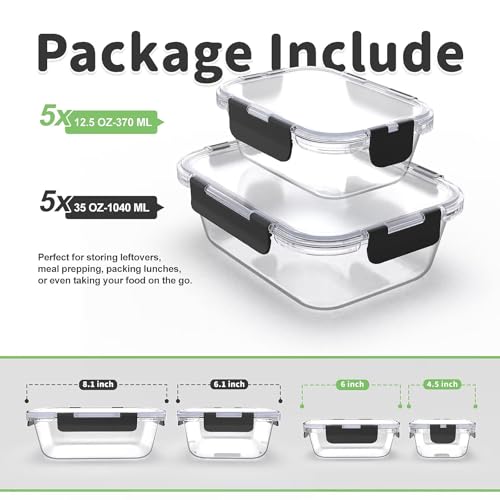 - 🍚【10 glass pre meal containers】Our cover glass container has 10 containers, including 5 35 ounce containers and 5 12.5 ounce containers, making it perfect for cooking. Their ideal size will help you control the portion size of the food. Maintain health and save time by cooking and freezing food. 35 oz size: 20.5 cm x 16 cm x 7 cm, 12.5 oz size: 15.5 cm x 11.8 cm x 5.8 cm.