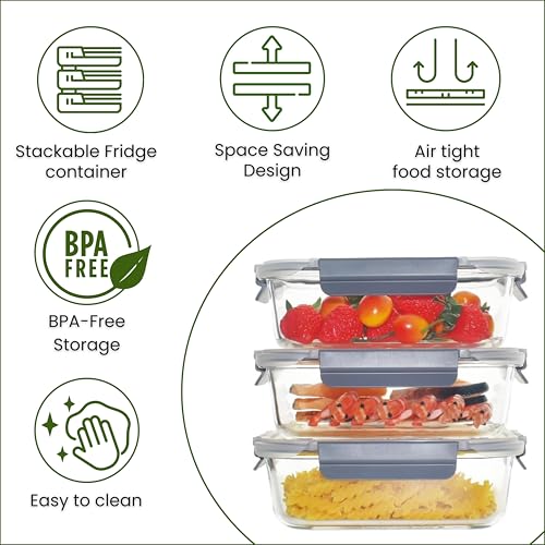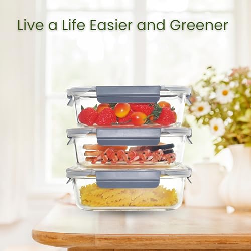 GRANZ Glass Food Storage Containers, BPA-Free Food Storage Containers, Airtight Snap Loc lid, Leak Proof Meal Prep Boxes, Stackable, Eco-Friendly, Reusable, Microwave & Dishwasher (3 Pack Large)