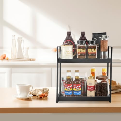 - 2-TIER COUNTERTOP ORGANIZER: Our 2-tier coffee corner station is a versatile tool for home storage, allowing you to optimize the use of any countertop or coffee area. It helps keep things neat and orderly, making it perfect for coffee tables, cosmetic storage, bedroom cabinets, bathrooms, kitchen spice racks, and more.
