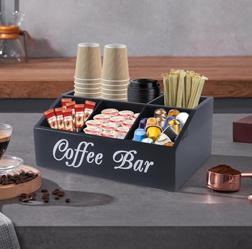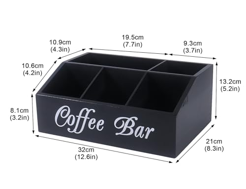 - Farmhuse coffee bar decor:The coffee cup and condiment organiser is not only practical but also add a touch of elegance to your kitchen.Features a unique carved design and black appearance,this wooden organiser for coffee station definately elevate any places with its minimalist aesthetic.