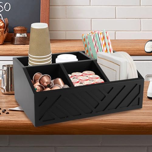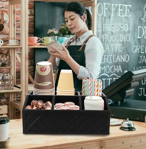 - Farmhuse coffee bar decor:The coffee cup and condiment organiser is not only practical but also add a touch of elegance to your kitchen.Features a unique carved design and black appearance,this wooden organiser for coffee station definately elevate any places with its minimalist aesthetic.
