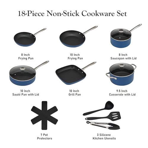 - 【18 PCS COOKWARE SET INCLUDES】 – 8" frying pan + 10.3" frying pan + 10.3" sauté pan with lid + 10.3" grill pan + 2.5qt saucepan with lid + 9.5 inch casserole with lid + 3pcs kitchen utensils + 6pcs pot protectors
