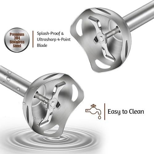 - High Quality Stainless Steel Blade: The immersion blender with ultra-hard stainless steel blades is easy to crush hard foods such as smoothies. Well-designed guards prevent food splashes during operation, keeping your kitchen clean while maintaining high-speed stirring. Safe to use.