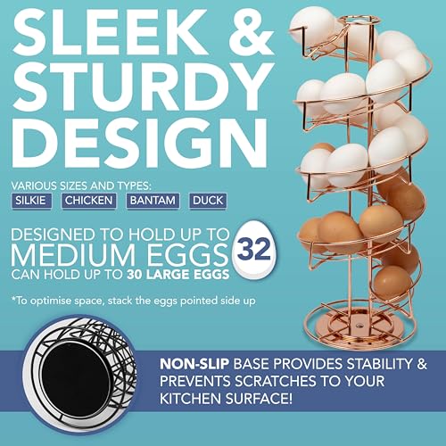 HEFTMAN Rose Gold Spiral Egg Holder – Freestanding Egg Storage for Kitchen for Up To 32 Eggs – Sturdy, Rotatable, Anti-Slip Base – Keep in Date Order, Roll Down Dispenser