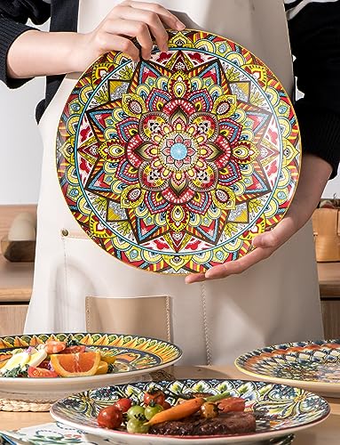 - PLATES IN DIFFERENT PATTERNS – Hand-painted art with vibrant colours and intricate motifs, dinnerware set makes meal a festive event. Thanks to the high temperatures used in colouring and glazing, ceramic plates will not fade. The bohemian design of dinner plates not only brings colour and style to your food, table and kitchen, also appetite and excitement to your family and guests.
