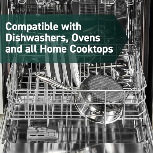 Patented hybrid technology utilises ‘tri-ply construction’ – aluminum between two layers of stainless-steel, laser-etched with our hexagonal ridges featuring a protected nonstick surface in the valleys to deliver the searing power of stainless steel, the durability of cast-iron and convenience of nonstick.