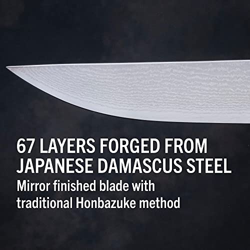 - 67 layers of Damascus steel for a harder, sharper blade that stays sharper longer. Full-tang construction for precision and control. Ergonomic pakkawood handle features anti-shrinking technology for added longevity.