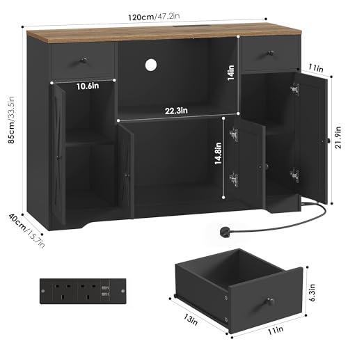 - Ample Storage: This sideboard features 4 doors, 2 drawers, and a spacious 120 x 40 cm countertop, offering plenty of room for your dishes, condiments, cups. Open compartments with cable management holes can hold small appliances such as microwaves and ovens, 2 adjustable shelves behind the doors can be set to 3 different heights to accommodate items of various sizes