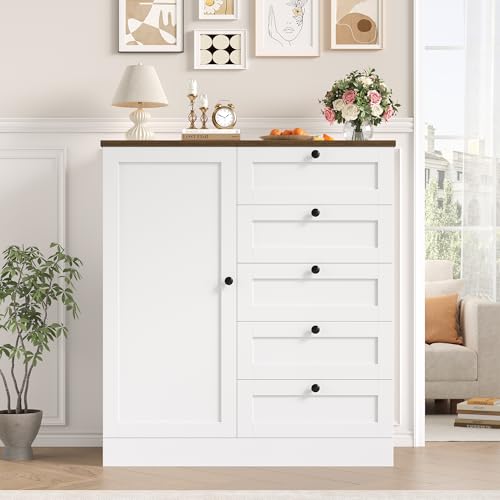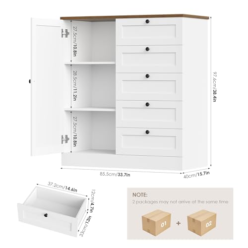 HOCSOK Sideboard, Kitchen Storage Cabinet, White Cupboard with 1 Door and Large Chest of 5 Drawers, Buffet Cabinet for Living Room, Kitchen, Hallway, Study, 85.5x40x97cm