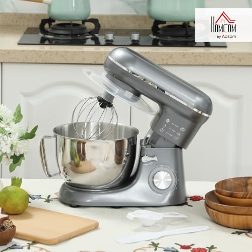 HOMCOM Stand Mixer, 4.5L Food Mixer for Baking, 6 Speeds and Pulse Setting, 1300W Cake Electric Whisk with Dough Hook, Whisk, Stainless Steel Bowl, Splash Guard, Beater, Silver Tone