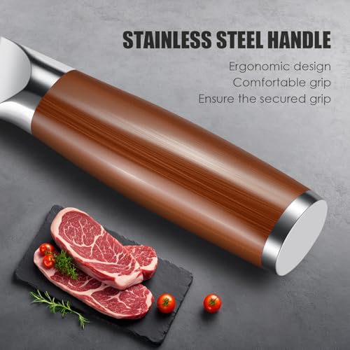 - 【Ergonomic Stainless steel Handle】The comfortable handles made of stainless steel. And the ergonomic Stainless steel design ensures perfect balance and a comfortable grip, relieve finger fatigue, making these knives ideal for both professional chefs and hobby cooks.