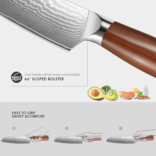Home Safety Santoku Knife, 7 inch Damascus Kitchen Knife Made of 67-Layers Damascus Steel, Professional Chef's Knives with Ergonomic Stainless Steel Handle for Chefs and Home Cooking, Gift Box
