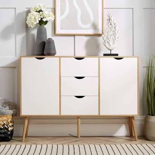 Home Source Sideboard Storage Cabinet, 2 Door, 3 Drawer Cupboard, Solid Wood Legs, Oak Effect White, Scandi Style