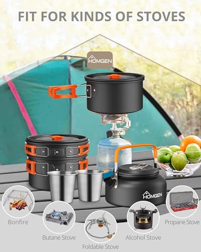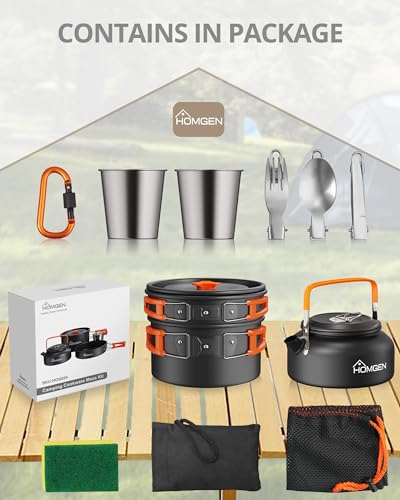 - *𝐇𝐎𝐌𝐆𝐄𝐍 𝐂𝐚𝐦𝐩𝐢𝐧𝐠 𝐂𝐨𝐨𝐤𝐢𝐧𝐠 𝐒𝐞𝐭*—–: Our HOMGEN Popular Camping Cookware Kit is Suitable for 2-3 People, with Complete Accessories Perfect for your Family Outdoor Camping. Let's Enjoy Camping Together!