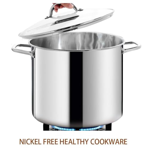 - THIS 19L STOCKPOT IS A NECESSARY ADDITION TO YOUR KITCHEN – This large 19L stockpot features the timeless French kitchen elegance design; cuts a fine figure both in the kitchen and at the dining table – Made of food grade NICKEL FREE stainless steel for better health and better nutrition – 7MM in base thickness and 2.6KG in weight – Great for boiling lobster, crab, or simmering stocks, soups for large crowds – Discover the gourmet chef in you with this beautiful and efficient stockpot.
