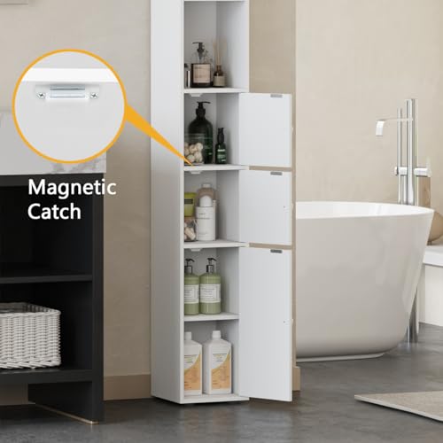 Homullel Tall Bathroom Cabinet, Freestanding Narrow Cupboard with 4 Doors & Open Compartments, Slim Tallboy Floor Storage Cabinet for Living Room Kitchen, 20x20x180cm, White