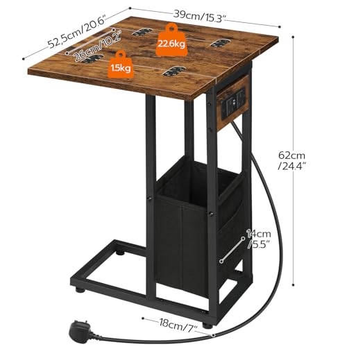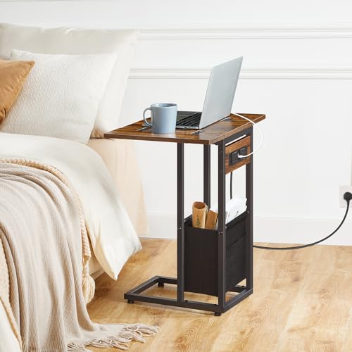 HOOBRO Foldable Side Table, C Shaped Side Table, Folding Small Table Sofa Table with Fabric Bag, Bedside Table with Charging Station, 2 USB Ports and 2 AC Outlets, Rustic Brown EBF30KSF01