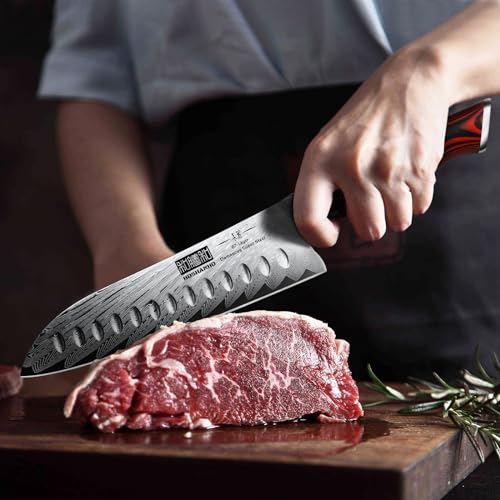 • Damascus Super Steel – This chef knife set is made with 67 layers of damascus super steel, offering an outstanding balance of sharp edge retention and durability. 33 layers of Damascus on each side surround the Japanese 10Cr15CoMoV steel core at HRC62±2 hardness, delivering long-lasting sharpness, and durability.