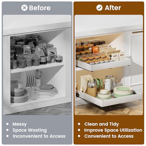 - Stable and Sturdy: The slide out cabinet organizer is made of high-quality carbon steel and equipped with heavy-duty metal rails, which can easily store pots, pans, bowls, dishes and small kitchen appliances, etc., to meet the storage needs of the kitchen. It is a powerful helper for home organization.