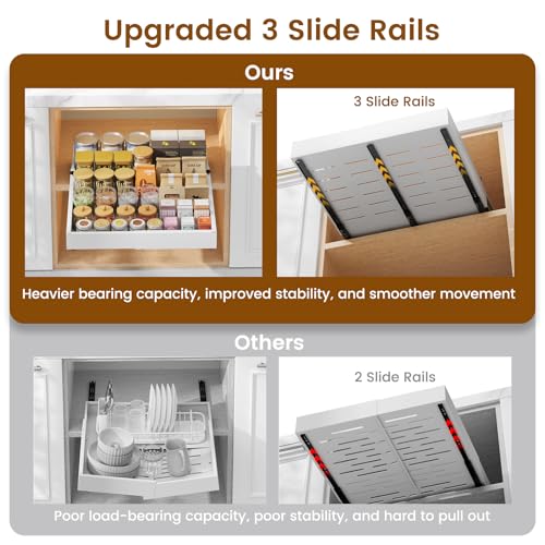 - 3-Guide Rails, Smooth and Silent: This cabinet organizer pull out drawer comes with three-track rails, can be fully extended, making it easy to take and store items at the back of the drawer, ensuring smooth and quiet sliding. Say goodbye to noise and jamming.