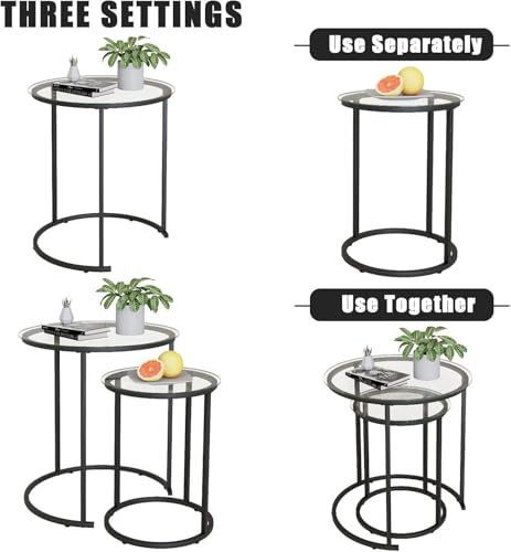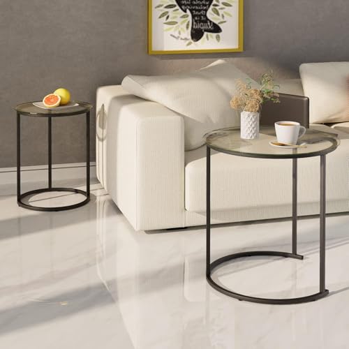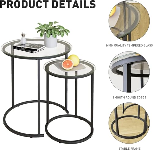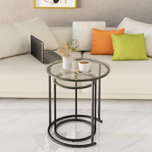 Huhote Round Coffee Tables, Set of 2 End Table, Nesting Tables, Side Table with Metal Frame for Living Room/Bedroom/Balcony/Office/Apartment, Diameter 19.6/13.7 IN (Black Frame, Glass Top)
