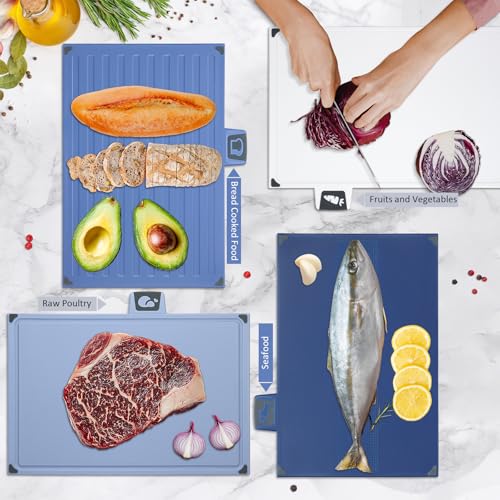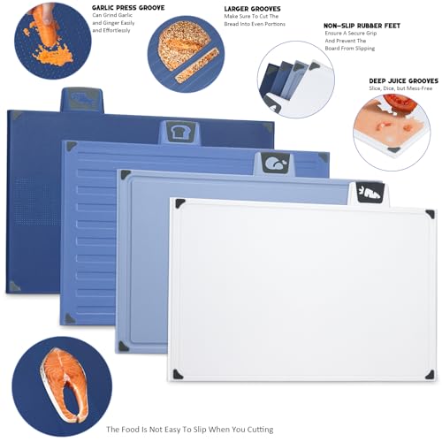 - JUICE GROOVE & NON-SLIP FEET: Our plastic cutting boards feature juice grooves around the edges to easily catch sticky or icky juice that is produced when cutting a roast or slicing juicy fruits, which keep your countertop or kitchen floor clean, making food preparation easier. Each chopping board has non-slip feet on all sides to provide a firm grip on your work surface, making you feel safe and secure while working with large cuts of meat or delicate vegetables, reducing the risk of accidents.