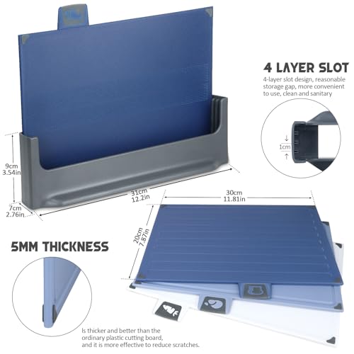 IAGORYUE Index Chopping Board Set, 4-Piece Colour Coded Thick Plastic Chopping Boards with Storage Stand,BPA Free Kitchen Cutting Boards with Non Slip Feet & Juice Groove for Meat Vegetable Bread Fish