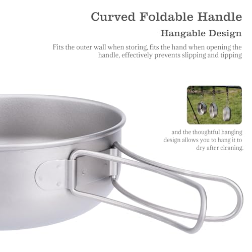 iBasingo Titanium Pot Pan Set Small Camping Cookware Outdoor Ultralight Kitchen Bowl Dish Cup 500ml 550ml 650ml Portable Cooking Kit with Folding Handle Travel Tableware for 1-2 People Ti2031C