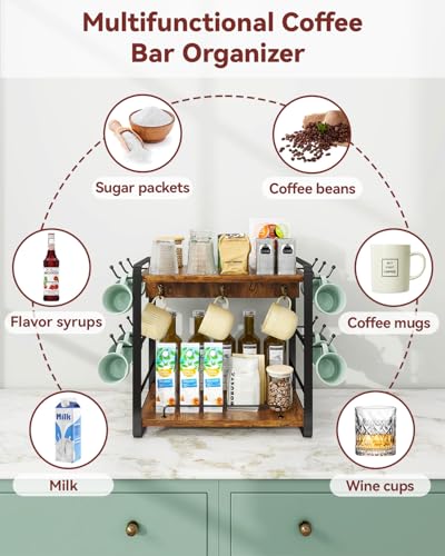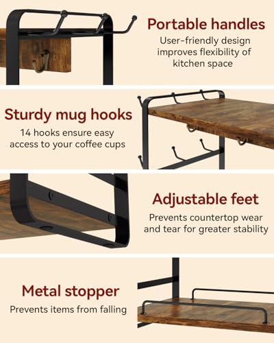 IBUYKE Coffee Bar Station Countertop Organizer,2 Tier Kitchen Mug Cup Holder Stand,Wooden Coffee Mug Organizer with 14 Hooks,Multifunctional Mug Tree for Home Kitchen, Office,Vintage Brown TBJ006H