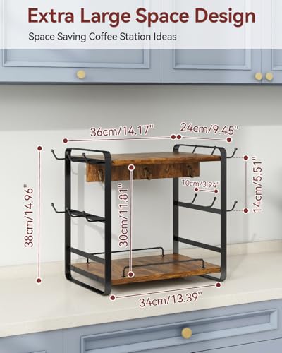 - 【Maximize Countertop Space】The Kitchen Coffee Cup Holder features double shelves, 6 front hooks and 12 side mug hooks to transform your home coffee counter. This design provides ample storage space for all your coffee essentials for any home kitchen or office coffee counter storage needs.