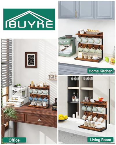 IBUYKE Rustic Coffee Mug Holder Stand, 2 Tier Countertop Mug Tree Holder Rack with Storage Base, Vintage Mug Holders for Kitchen, Holds 8 Mugs, Rustic Brown TBJ002H