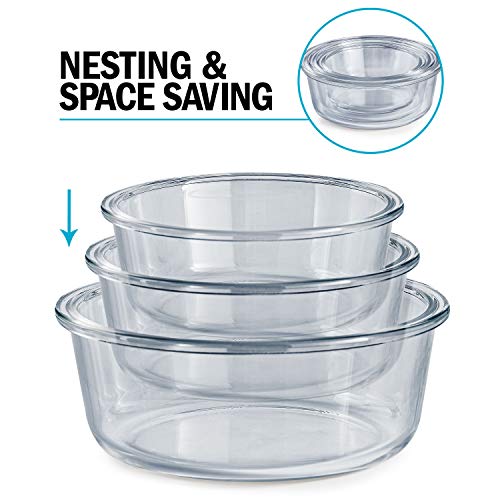 - Round Multi-Sized Glass Containers: Three versatile sizes, ideal for fruit, salad, snacks, soup and more; Nonporous glass won’t absorb food odours, flavours, or stains and BPA-free polypropylene lid is odourless, leaving food tasting just the way you prepared it; Container sizes: 400ml / 14oz = 13.5 cm (d) x 6.1 cm (h), 650ml / 22oz= 15.4 cm (d) x 6.8 cm (h), 950ml / 32oz = 17.7 cm (d) x 7.4 cm (h)
