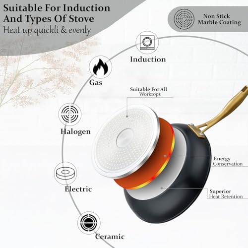- High Quality Material—Our 9pc cookware set with lids are constructed from a heavy duty forged aluminum body, with a lovely marble effect non stick outer layer, a strong and reliable addition to your home!