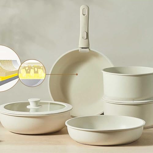 Induction Pan Sets, Gourmet Pan Set | Cooking Pots and Pans for Cooking | Non-Stick Cream White Detachable Handle for Cooking Casserole Cookware Set